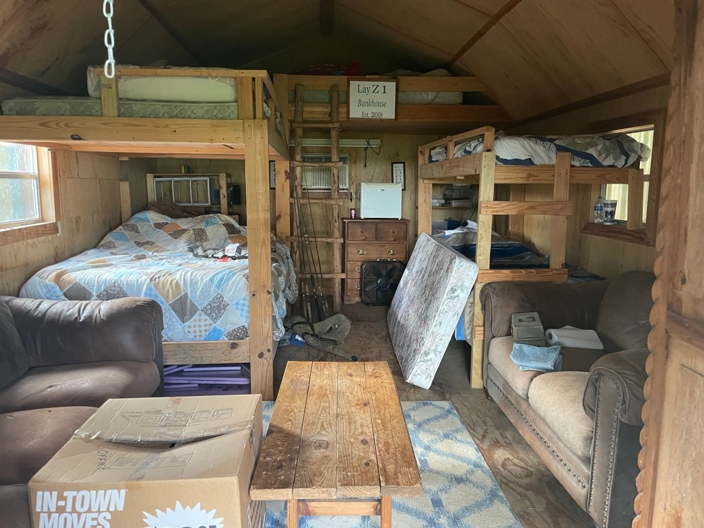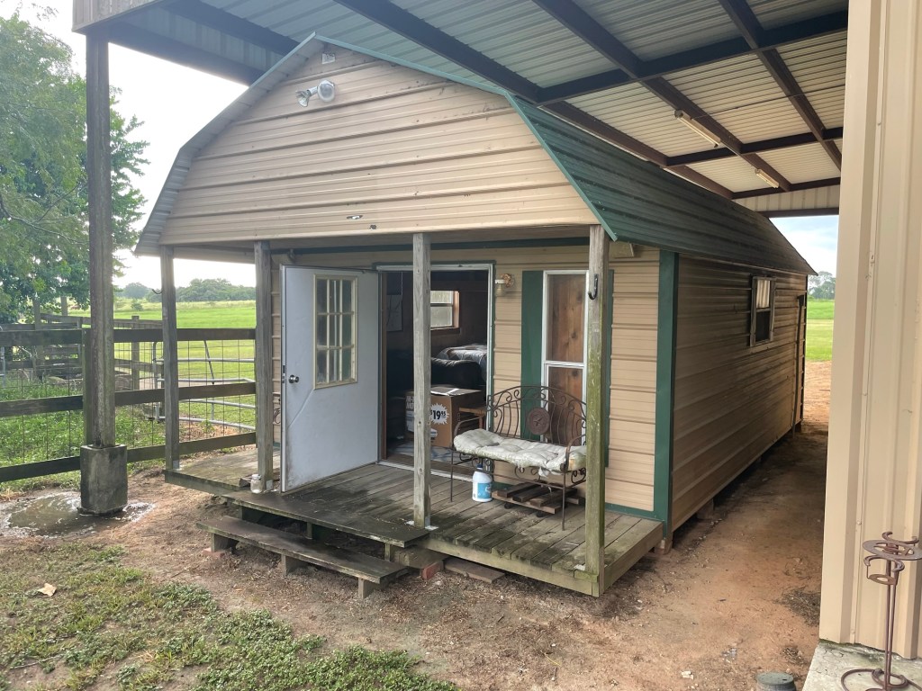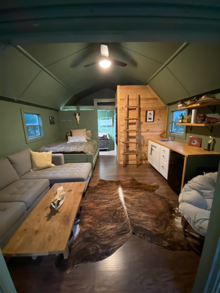 We debated it all…we looked at campers that he could stay in and then we use when we wanted to travel but geez they are so expensive right now. We moved on from that idea. Next was a container house, I wasn’t crazy at how narrow they were and it was still going to be pricey to finish out, but the big reason we didn’t go with it is the company that moves them needed a 100 foot space to drop it…we kept trees in between our house and his and so we didn’t have that as an option. While debating what our next move was my mother in law offered us her old candle shop that we had converted into a bunk house a few years ago. It was next to her barn and really wasn’t used much. We were super excited to get it and save lots of $$.